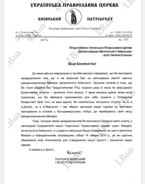 «До меня дошла информация из СМИ, что Вы выразили недовольство тем, что я не пригласил вас на празднование памяти священномученика Макария. Причина заключается в том, что вы, после избрания вас Предстоятелем УПЦ, ни разу со мной не совершали Божественную литургию – на протяжении пяти месяцев. У меня возникла мысль, может она ошибочна, что Вы считаете унижением для себя служить с патриархом Филаретом? Кроме того, как мне известно, вы пытаетесь послужить литургию то в г. Днепре или в г. Мариуполе и там собрать архиереев нашей Церкви в противовес празднованию в Киеве… Поскольку своим недовольством Вы выразили желание принять участие в праздновании покровителя нашей Украинской Православной Церкви сщмч. Макария, митрополита Киевского, я с радостью приглашаю Ваше Блаженство на праздник святителя Макария в кафедральном патриаршем соборе 14 мая 2019, где мы ежегодно собираемся всем епископатом для утверждения нашего единства и укрепления нашей Церкви».