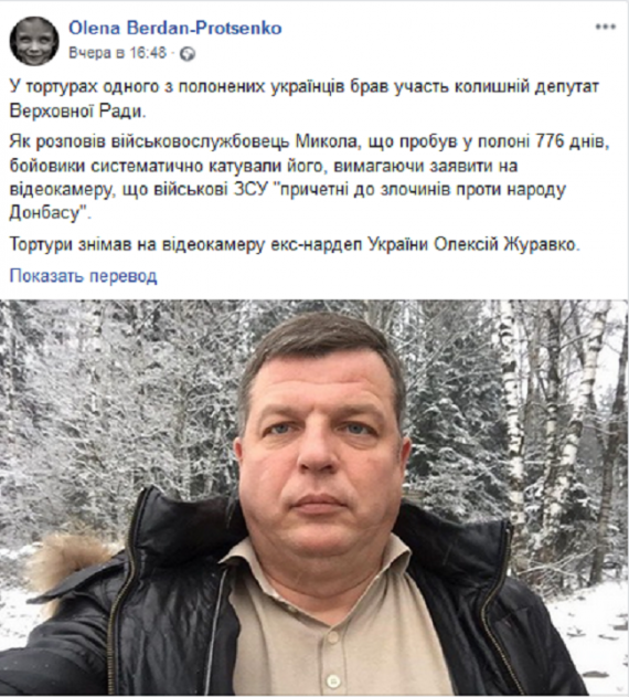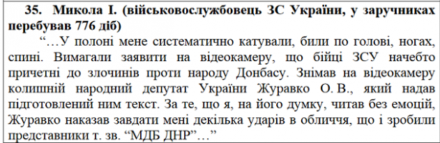 «…В плену меня систематически пытали, били по голове, ногам, спине. Требовали заявить на видеокамеру, что бойцы ВСУ вроде причастны к преступлениям против народа Донбасса. Снимал на видеокамеру бывший народный депутат Украины Журавко А. В., который предоставил подготовленный им текст. За то, что я, по его мнению, читал без эмоций, Журавко приказал нанести мне несколько ударов в лицо».