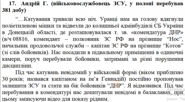 Так, в отчете приводится свидетельство некоего Николая (фамилия не указана), который представлен как военнослужащий ВС Украины, находившийся в плену 776 суток: