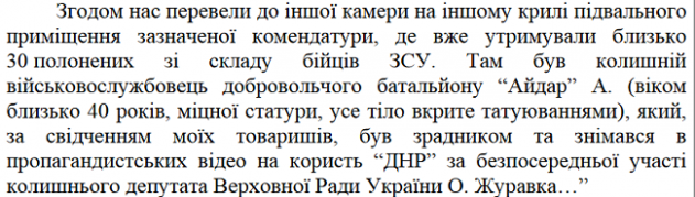 «…Нас перевели в другую камеру на другом крыле подвального помещения указанной комендатуры, где уже содержалось около 30 пленных из числа бойцов ВСУ. Там находился бывший военнослужащий добровольческого батальона «Айдар» А. (по возрасту около 40 лет, крепкого сложения, все тело покрыто татуировками), который по свидетельству моих товарищей был изменником и снимался в пропагандистских видео в пользу «ДНР», при непосредственном участии бывшего депутата Верховного Совета Украины Алексея Журавко».