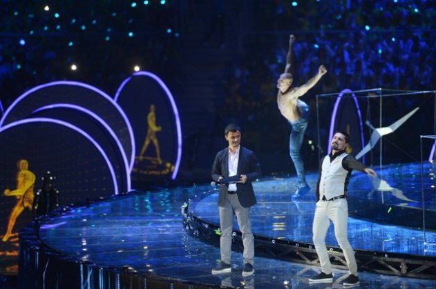 Артём Оганов и Дима Билан во время театрального представления на церемонии открытия XIX Всемирного фестиваля молодежи и студентов