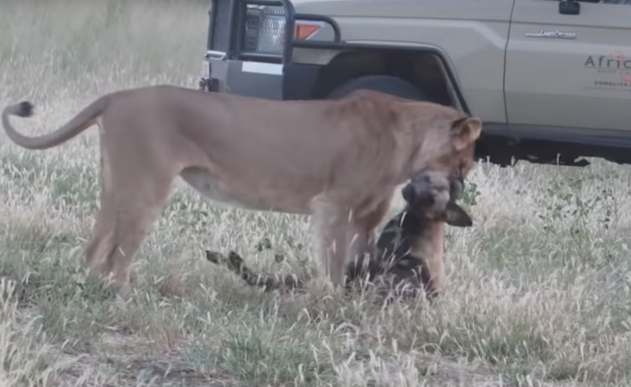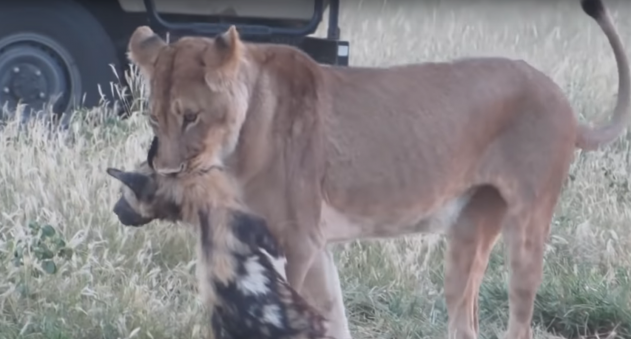 Но не только посетители парка наблюдали за стаей. Позже ее заметила львица, одна из дочерей печально известного льва Сесиля. Сейчас она заботится о своих детенышах и является в национальном парке кем-то вроде знаменитости – все с интересом следят за ее жизнью. Недолго думая, львица начала преследовать зверей и вскоре поймала одну из собак. Оказавшись в пасти хищницы, гиеновидная собака недвижно повисла в ее зубах, не подавая никаких признаков жизни. А дальше события приняли неожиданный для всех (кроме, пожалуй, самих гиеновидных собак) поворот.