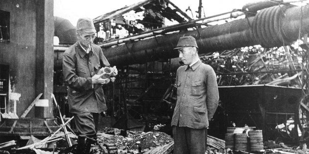 Японский промышленник Рюозо Асано осматривает разрушения на своём сталелитейном заводе 6. Эффект от рейда был чисто пропагандистским, так как результаты бомбардировки и близко не оправдывали потерю 16 самолётов