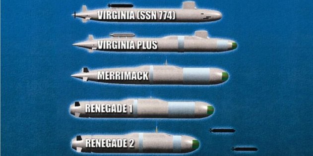 Уже на смену «Вирджинии+» пришли бы субмарины класса «Ренегат» — дальнейшие развитие конструкции «Мерримак». В движение подлодку приводил бы доработанный водомётный двигатель, более тихий, чем обычные винты. Вместо обычного вертикального орудия «Ренегату» полагалось электромагнитное, а также лазерная система ПВО. Экипаж сократился бы ещё больше — до 20 человек.