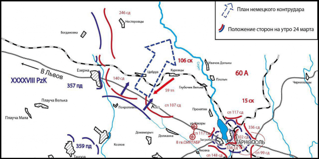 В чём «тигры» оказывались сильны, так это в танковых дуэлях. Двадцать третьего марта в 8:00 «тридцатьчетвёрки» 59-го тп, продвигаясь от Куровцев, достигли шоссе на Львов. Именно здесь произошло их столкновение с вновь прибывшими «тиграми», двигавшимися от Езерны. Исход боя был более чем предсказуем: 59-й танковый полк потерял восемь Т-34 подбитыми и сгоревшими и отошёл назад.