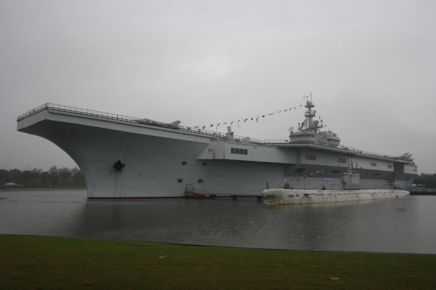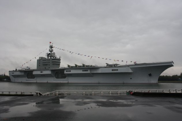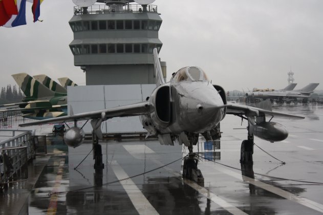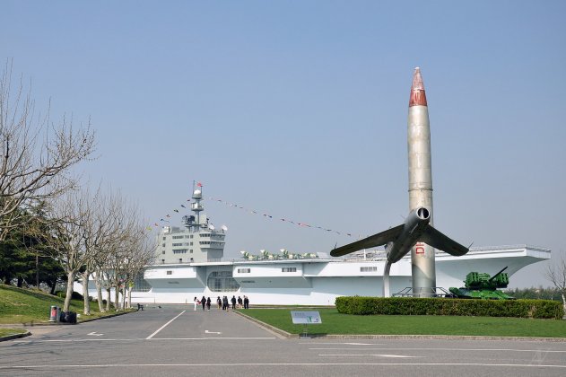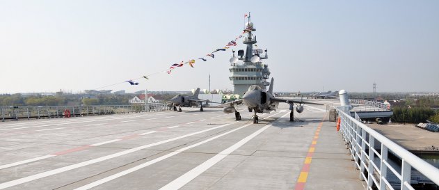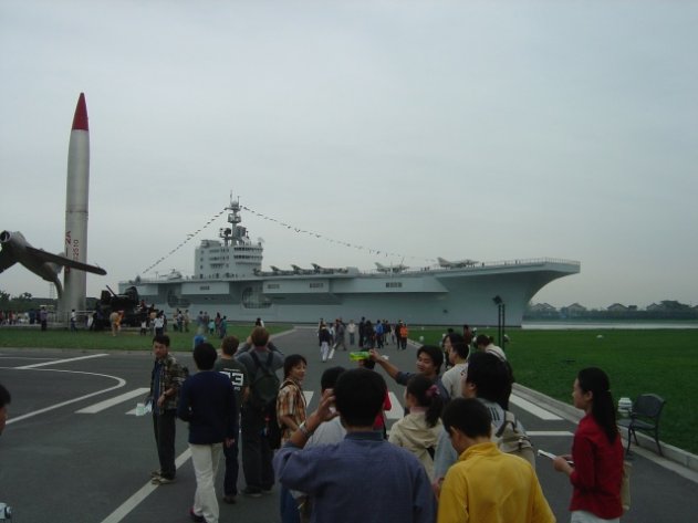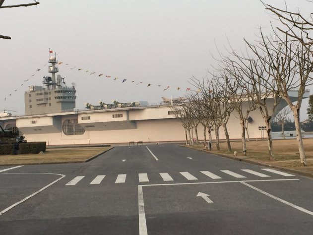 На самом деле это здание длиной около 220 м, стилизованное под авианосец. Оно расположено на территории Военного образовательного центра в 50 км к западу от Шанхая на берегах озера Дианшан.