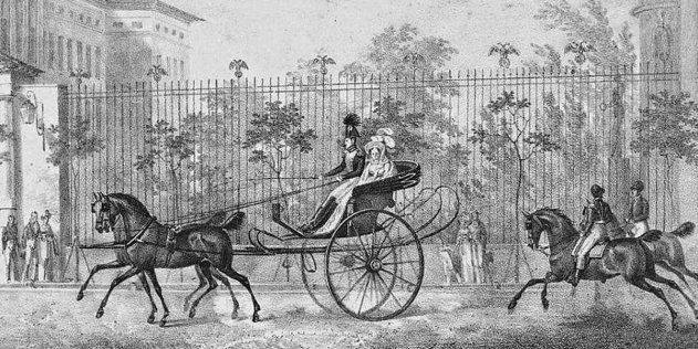 «Николай I и императрица Александра Фёдоровна в коляске у сада Аничкова дворца», начало 1820-х, неизвестный литограф