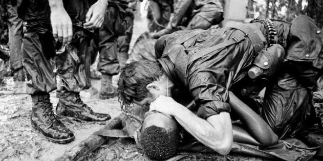 Защита раненого Обычный американский пехотинец в патруле тащил «на горбу» от 27 до, если не повезёт, 45 кило груза. Один из вариантов нагрузки — минимум 300 патронов для винтовки М-16, сто патронов для пулемёта М-60, шесть ручных осколочных гранат и шесть гранат для гранатомёта М-79. И это всё на одного! С таким грузом по узкой горной тропе среди густого леса, да ещё на влажной жаре особо не побегаешь. Где нет леса — сплошные «складки» известняка. Видимость — сотня метров.