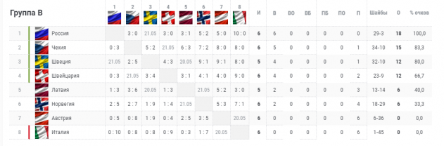 Сборная России, ранее обеспечившая себе место в плей-офф чемпионата мира, набрав 18 очков в шести встречах, занимает первое место в группе. Команда Швейцарии (12) идет на четвертой строчке. Россияне в заключительном матче группового этапа сыграют 21 мая со шведами, швейцарцы в этот же день встретятся с чехами.