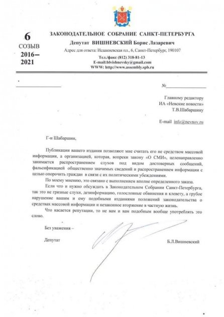 Издание НЕВСКИЕ НОВОСТИ направило Вишневскому запрос с просьбой разъяснить происходящее. Журналисты спросили, почему ЗакС ничего не предпринимает касательно сложившейся ситуации.