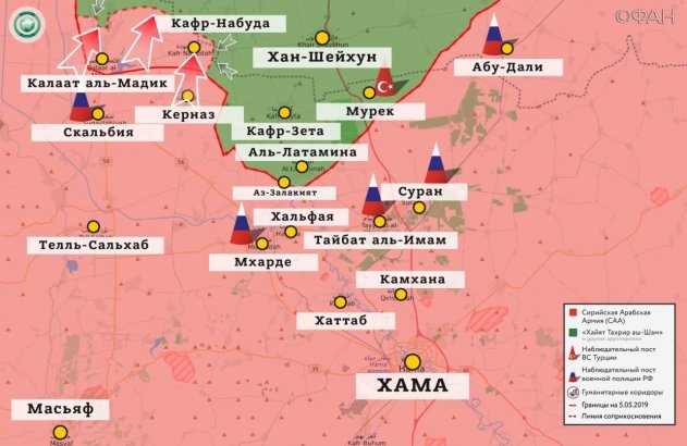 В ответ на этот обстрел, сегодня ВКС России нанесли удар по позициям ХТШ в городах Хан-Шейхун, Джиср эш-Шугур и Кафр-Набаль. Несмотря на заявленное перемирие, мы наблюдаем ожесточенные попытки контрнаступлений групп боевиков по всех линии соприкосновения в Идлибской зоне деэскалации и попытки обстрела российской авиабазы в Хмеймиме. Видится, что если джихадисты не оставят своих попыток, то САА при поддержке ВКС Росии будут вынуждены продолжить наступательную операцию.