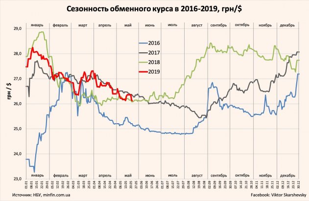 После первого тура президентских выборов гривна укрепилась на 4,3% (1,18 грн/$) до 26,15 грн/$ и по состоянию на 21 мая всего на 7 копеек дешевле, чем год назад в это время (26,08 грн/$ на 21 мая 2018).
