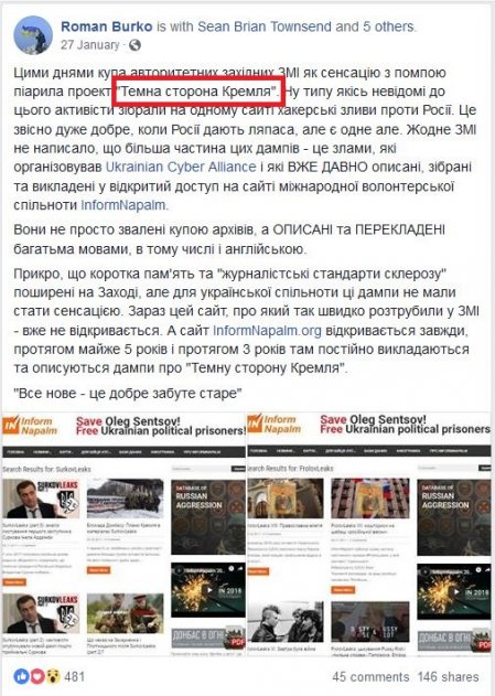Нас заинтересовал архив (MIL DOCUMENTS.zip), который еще в марте прошлого года «анонсировал» спикер «Украинского киберальянса» Шон Таунсед (Sean Brian Townsend), он же представитель сайта Информнапалм (Informnapalm). И на протяжении последнего времени пиаром этого же массива также занимается Роман Бурко. Под данным псевдонимом уже сменив не одно лицо, скрываются все те же «волонтеры» из военной конторки недоумков. Мы давно открыли всем глаза на то, что этот сайт курируют люди в погонах, и никакого волонтерства там нет. Нами доказано, что это проект ВСУ и управляют им офицеры 72 ЦИПсО.