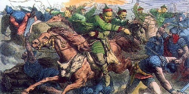 На самом ли деле Олег прибивал свой щит к вратам Царьграда, звали ли Ярослава Мудрым и в каком году по-настоящему свергли ордынское иго? На все эти и многие другие вопросы о русской истории есть ответы, которые не пишут в учебниках. Мы расскажем вам о самых интересных. 1. Во времена расцвета Римской империи славяне населяли территории Восточной Европы от Вислы до Десны Славяне были замечены на исторической сцене в VI веке н. э. Появились они, конечно, несколько раньше. Но на указанных территориях во времена расцвета Римской империи их не было. Исторические атласы, указывающие на подобное, лукавят. Но кто же там жил? Двигаясь от устья Вислы, германское племя готов в начале III века н. э. достигло Причерноморья. Незадолго до этого на правобережье Днепра в результате сарматского нашествия была уничтожена зарубинецкая культура. Историки пока не смогли договориться о её этнической принадлежности. Выжившее население разбежалось, спасаясь от кочевников. Территории к югу от Припяти сильно опустели… Готы назвали страну Ойюм. На этих землях готы (вместе с другими племенами) и создали черняховскую культуру. Их поселения были разбросаны от Трансильвании до курского посемья, где граничили с венетами — предками славян. Карта расселения готов и венетов Справка. По Фасмеру, от готов в славянский язык вошло много слов — например, «князь» и «хлеб». Даже слово «Рим» к нам пришло через готский язык, поэтому мы и произносим название этого города в такой форме, а не как Roma. После «скифской войны» в III веке н. э. племена готов в течение века жили в мирном симбиозе с Римской империей. Империя платила, а те верно служили ей, поставляя воинов и защищая от варваров. Земли готов порой даже рассматривались как часть империи — с «широким автономным статусом». И лишь нашествие гуннов (в конце IV века), которые разбили остготов и разорили земли вестготов, положило этому конец. Спасаясь от этой волны кочевников, вестготы и аланы переселились за Дунай, и в течение последующих ста лет разрушали империю… Небольшая группа готов осталась лишь в Крыму, где они спустя тысячу лет растворились среди греков и татар. И. Гейгер, «Гунны в битве с аланами» Когда готы покинули земли к югу от Припяти (вестготы поселились в Испании, а остготы в Италии), на вновь опустевшие земли пришли наши предки, и в этих благоприятных условиях произошёл резкий рост населения. Вскоре славяне уже оказались и на территориях от верхней Вислы до Десны. А в VI веке, не без помощи аваров, началось Великое расселение славян. 2. Древнерусское государство объединило племена полян, древлян, северян, кривичей. На первый взгляд, тут всё правильно. Но эти названия означают не племена. Это — «славинии», не племенные, а политические объединения. На их основе у славян формировались государства. Законы истории действуют одинаково — в это время они создавались и у южных, и у западных славян. Именно с образованием славиний историк Антон Горский связывает произошедшую у славян смену племенных названий. В славиниях была своя элита, свои князья, которые с помощью дружин собирали полюдье. О них мы, к сожалению, знаем очень мало. Так, у словен в Новгороде и полян в Киеве к власти пришли князья варяжского происхождения, но обстоятельства этого точно неизвестны. 3. Олег прибил свой щит на вратах Царьграда Н. Бодаревский, «Князь Олег 