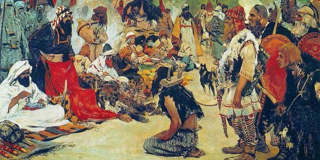 С. Иванов, «Торг в стране восточных славян» Рабы шли на экспорт в Византию и дальше на Ближний Восток. В Константинополе живой товар меняли на серебро и шёлк, который там производился. Византийские шёлковые ткани и были вожделенной целью славянской знати — символом престижа и статуса.