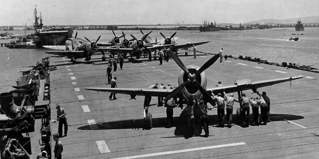 Палубная команда американского «Натома Бэй» за работой Британские морские лётчики, долгое время бывшие на вторых ролях, так и остались нелюбимыми кузенами «настоящего» флота и довольствовались тем, что дадут. А на фоне огромного военного перенапряжения всего британского флота и имперской экономики они уже не могли выдавать нечто значимое.