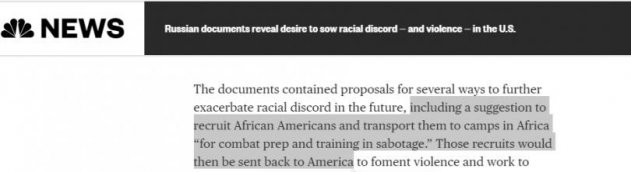 В частности, сообщается, что «Россия собирается вербовать афроамериканцев в США, затем отправлять их в расположенные в Африке боевые лагеря, где готовить на курсах военной подготовки и саботажа». После чего их «планируется отправлять обратно в США».