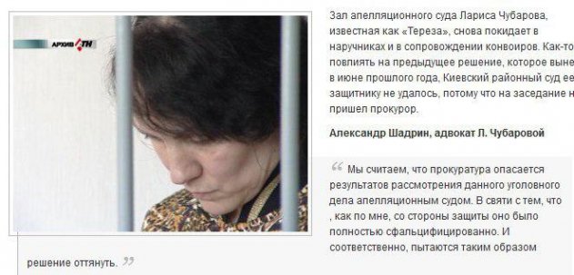 А теперь оценим уровень украинских СМИ, обеспечивавших информационное сопровождение судебных процессов над политзаключенными. Вот сайт харьковского канала АТН приводит слова адвоката Шадрина о деле Чубаровой: «Мы считаем, что прокуратура опасается результатов рассмотрения данного уголовного дела апелляционным судом. В связи с тем, что, как по мне, со стороны защиты оно было полностью сфальсифицировано. И соответственно, пытаются таким образом решение оттянуть».