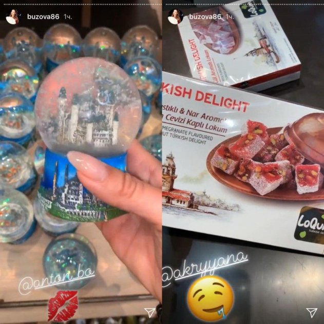 Позже в Instagram-«сторис» певица показала, что купила и повезет в Россию. Оказалось, что своему пиар-менеджеру, а по совместительству и хорошему другу Антону Богославскому она купила сувенир, который называют снежным шаром, а близкой подруге Яне Акру привезет из Турции магнитик и популярную в стране сладость лукум.