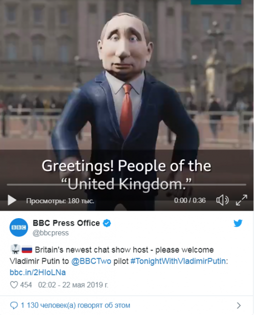 Ранее британская телерадиокорпорация Би-би-си объявила о запуске ток-шоу, ведущим которого станет разработанный в 3D-графике мультипликационный персонаж, изображающий президента России.