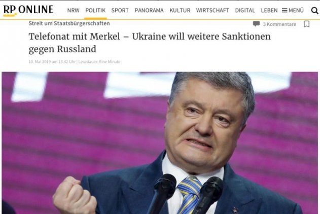 «В споре о предоставлении российского гражданства по упрощённой процедуре жителям непризнанных республик Донбасса Украина надеется на поддержку со стороны Германии, а также рассчитывает на дальнейшее усиление санкции против России. Об этом действующий президент Украины Пётр Порошенко сказал по телефону канцлеру Германии Ангеле Меркель», – сообщает статья, опубликованная на сайте немецкой медиакомпании Rheinische Post Mediengruppe (RP).
