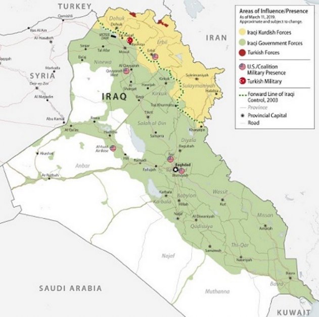 Ситуация в Ираке на март 2019 года с обозначением американских баз