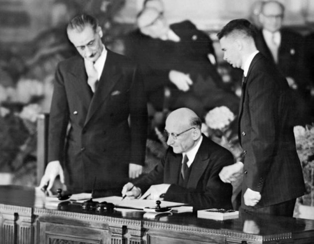 Министр иностранных дел Франции Робер Шуман подписывает Североатлантический договор в Вашингтоне. 4 апреля 1949