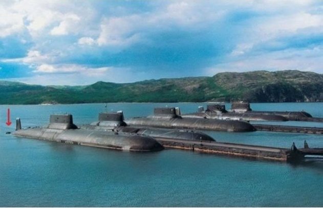 Обратите внимание на деталь, выделенную красной стрелкой. Эти маленькие темные фрагменты — выступающие над водой винты подлодки проекта «Акула».