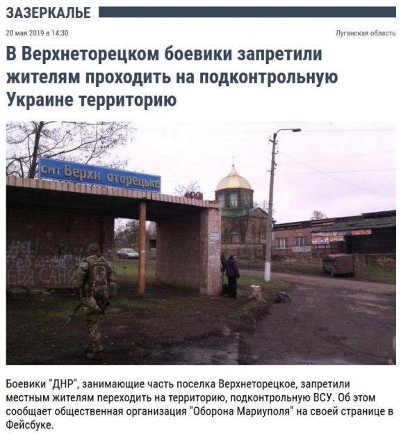 Второй момент. Совсем недавно, в статье за 20 мая 2019 года, украинские СМИ утверждали, что Верхнеторецкое частично контролируется НМ ДНР.