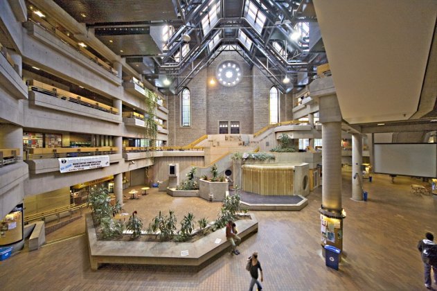 Я там был на экскурсии. Сам храм, визуально по размерам больше Нотр Дама, пуст - одни скамейки. Многие церкви переделываются в учебные заведения. Вот так выглядит главный корпус UQAM (Universite du Quebec a Montreal)