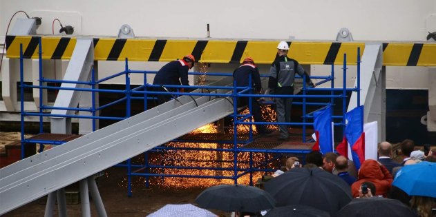 Как можно увидеть на фото, на стапелях ледокол удерживает серый металлический задержник приличной толщины. Процесс происходит следующим образом. Сначала крёстная мать (для «Урала» ею стала председатель Центробанка РФ Эльвира Набиуллина) разбивает о борт корабля бутылку крымского шампанского. Затем перерезают ленту, а батюшка освящает судно. Лишь после этого подаётся команда на проверку акватории Невы — свободна ли она. И, если всё в порядке, начинается перерезание задержника. Два рабочих, имеющих «черные пояса» по газовой сварке, режут металл, раскрашивая питерский день миллионами оранжевых искр.