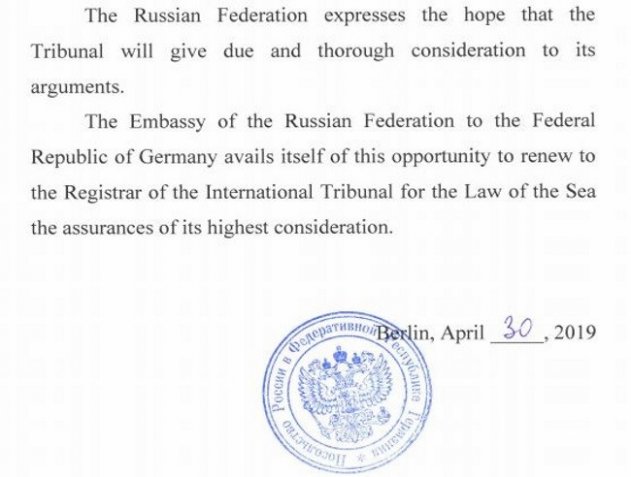 Военный характер инцидента не подлежит сомнению. Поэтому решение Международного трибунала по морскому праву не имеет для России юридической силы. Впрочем, Россия готова к сотрудничеству в разрешении инцидента, в том числе в рамках данного трибунала.