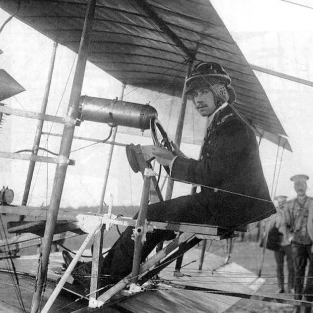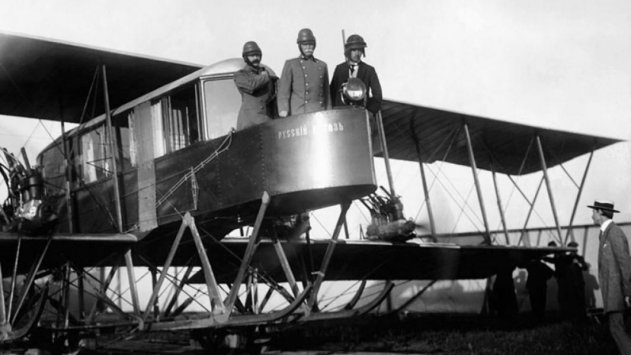 Авиаторы Сикорский, Геннер и Каульбарс на борту самолета «Русский витязь». 1913 год