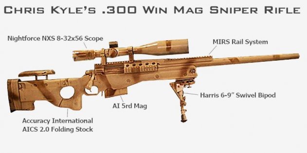 В снайперской работе он предпочитал патрон .300 WinMag, попутно модифицируя уже имеющееся оружие: соединяя, например, «аппер» от Mk12 с базой карабина М4. Получившийся образец становился более компактным и имел регулируемый по длине телескопический приклад. Кайл познакомился и с новыми образцами: на вооружение поступили «болтовые» винтовки всё в том же «трёхсотом» калибре, но оснащённые улучшенной ложей от компании «Эккураси Интернешнл».