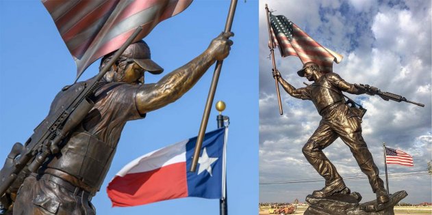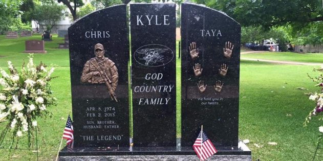 На надгробном камне Кайл изображён с винтовкой SR-25 (Mk.11), а вот на памятнике, установленном в родном городе Одессе (Техас), его вооружение более обширно: скульптор Грег Марра вооружил покойного сразу и винтовкой AI Mk.13 под патрон .300 WinMag, и карабином М4А1, да и набедренная кобура на правой ноге тоже не пустует (судя по форме и наклону рукояти, в ней располагается всё тот же «Спрингфилд TRP Оператор .45»).