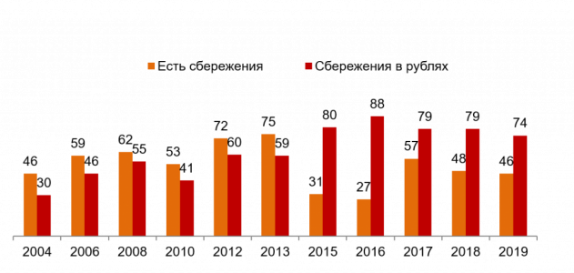 Сбережения имеют 46% россиян, но объем сбережений в рублях сокращается. Доля россиян, имеющих сбережения снизилась по сравнению с предыдущими двумя годами.