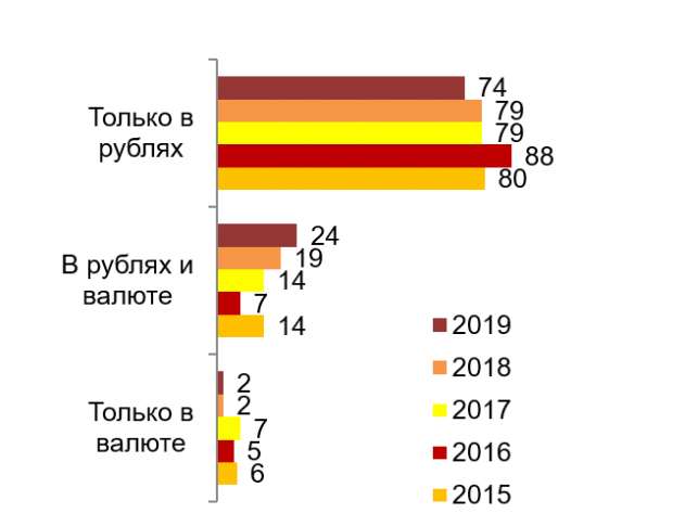 Доля россиян, которые хранят свои сбережения только в национальной валюте, за год снизилась на 5% – с 79% до 74%. В валюте, т.е. долларах и евро, хранят накопления всего 2% опрошенных. Эта цифра не меняется уже второй год. Однако за год увеличилось число тех, кто хранит сбережения как в рублях, так и в валюте. Подобный тренд набирает популярность уже четвертый год подряд: 7% в 2016 году, 14% в 2017, 19% в 2018 и, наконец, 24% - в текущем (см. Гистограмму 2).