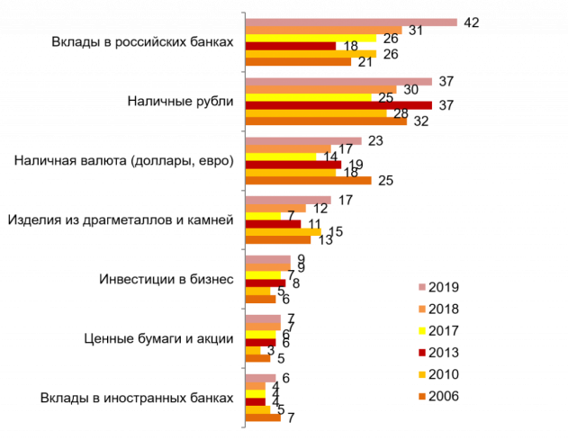 Лучшими способами хранения сбережений, с точки зрения сохранности, россияне по-прежнему считают вклады в российских банках (42%) и наличные рубли (37%). Третье место по надежности респонденты отдали наличной валюте (23%). 17% россиян считают надежным вложением средств в драгметаллы. По остальным же способам сохранности сбережений изменений за год не произошло. По-прежнему об инвестициях в бизнес, как способе удачного вложения денег, заявили 9% респондентов. Ценные бумаги рассматривают в качестве вложения 7% опрошенных. А вклады в иностранных банках привлекают 6% респондентов.