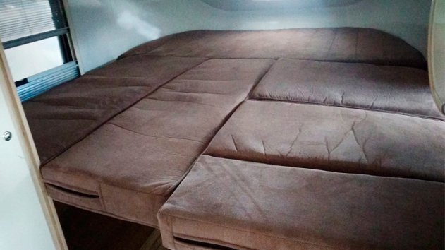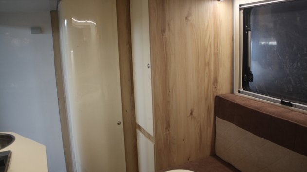 Соответственно, автодом оборудован двумя спальными местами, одно из которых стационарное, а второе посредством нехитрых манипуляций превращает его в двуспальную кровать-трансформер в "альковной" зоне. Предусмотрен и компактно вписанный в дизайн шкаф-гардероб.