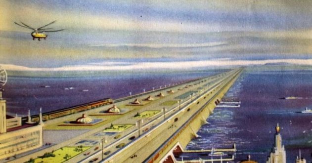 Впрочем, в 70-е годы рождались и еще более странные предложения. Так, архитектору Казимиру Луческому, видимо, не давала покоя слава Ле Корбюзье. Поэтому он, взяв за основу идею с плотиной через Берингов пролив, предлагал её улучшить. Например, путем постройки на плотине города – с эскалаторами, автомагистралью, домами и террасами для любования морем. Мысль, в какой-то степени, еще более странная, нежели сама плотина. Как будто вокруг совершенно нет свободной земли. А еще, во избежание грандиозных пробок в будущем, каждый квадратный сантиметр такой плотины лучше бы использовать под транспортные, а не жилые нужды.