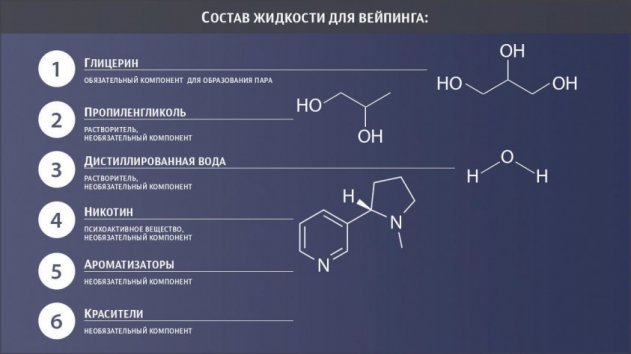 Жидкость для вейпинга содержит глицерин, растворители и различные добавки. Продукты их распада при длительном использовании могут нанести вред – например, спровоцировать хронические бронхиты у подростков.