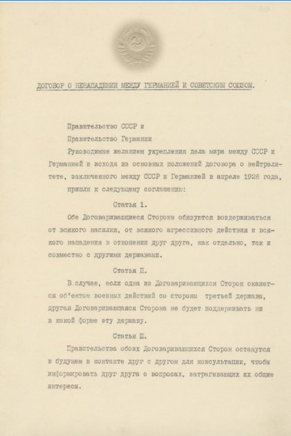 Договор о ненападении между СССР и Германией. 23 августа 1939 г. Советский оригинал на русском языке.