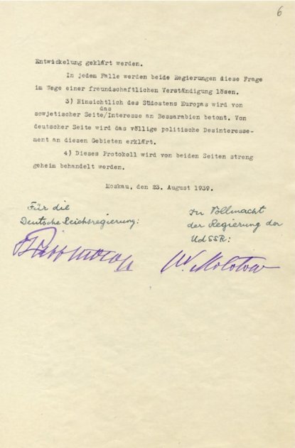 Секретный дополнительный протокол к Договору о ненападении между СССР и Германией. 23 августа 1939 г. Советский оригинал на немецком языке.