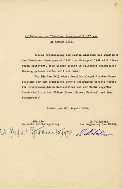 Разъяснение к секретному дополнительному протоколу к Договору о ненападении между СССР и Германией. 28 августа 1939 г. Советский оригинал на немецком языке.