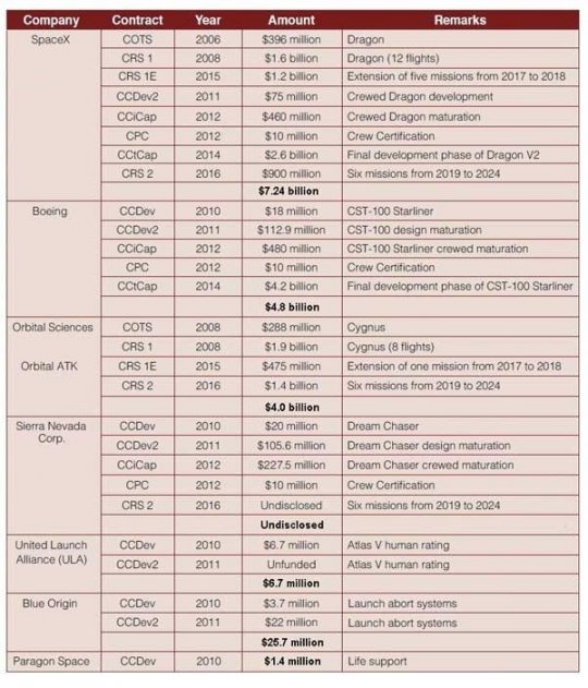 Опять же, если вы сравните суммы, которые получает Space со значениями, получаемыми другими поставщиками запуска для аналогичных целей - они всегда находятся на нижнем уровне. Например, CRS 1 и 1E, Space получает 2,8 миллиарда долларов на 17 миссий (~ 165 миллионов долларов каждая), в то время как Orbital получает ~ 3,8 миллиарда долларов на 15 миссий (~ 252 миллиона долларов каждая). Для CRS2 SpaceX получает 900 миллионов долларов за шесть миссий (150 миллионов долларов каждая - сокращение на 9% по сравнению с CRS1), в то время как Orbital ATK получает 1,4 миллиарда долларов США за шесть миссий (233 миллиона долларов каждая - сокращение на 7,5% по сравнению с CRS1).