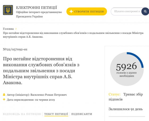 Петиция с требованием отставки министра МВД Украины за неполных два дня собрала более 5 тысяч подписей.