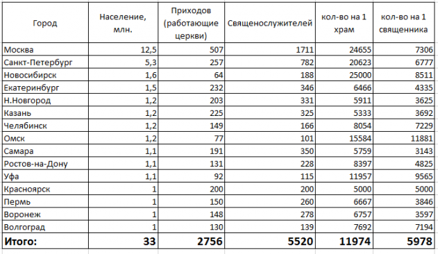 Анализируем, на 33 млн.человек, проживающих в крупных городах России приходится всего лишь 2756 действующих храмов. Сравните с Украиной, при примерно таком же населении всей Украины, там действует 12122 приходов, то есть в более чем 4 раза больше.