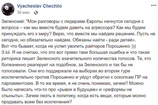 Я не считаю, что это вот прямо таки большая ошибка и что такая риторика лишит Зеленского значительного количества голосов. Те, кто болезненно реагирует на подобное, за Зеленского и так бы не голосовали. Они его поддержали на выборах во втором туре исключительно против Порошенко и уйдут обратно к осколкам ПР на парламентских. В то же время, я не очень понимаю, зачем? Можно было написать что-то про "рывок в будущее" и "реформы не спыныты". Зачем лезть в политику, когда есть вещи, которые можно продавать всем без исключения?", - удивляется журналист Вячеслав Чечило.