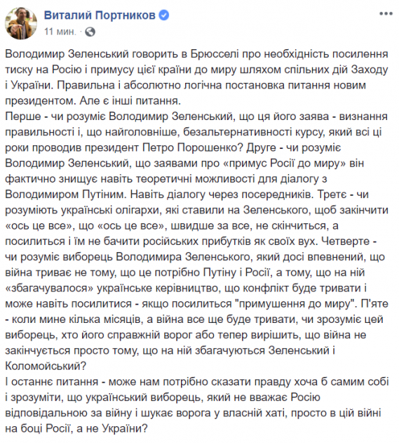 "Понимает ли Владимир Зеленский, что это его заявление - признание правильности и, что самое главное, безальтернативности курса, который все эти годы проводил президент Петр Порошенко? Второе - понимает ли Владимир Зеленский, что заявлениями о "принуждении России к миру" он фактически уничтожает даже теоретические возможности для диалога с Владимиром Путиным.