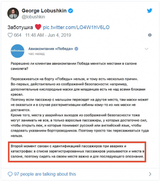 Сегодня днём российская компания «Победа» опубликовала в «Twitter»-аккаунте сообщение, в котором попыталась объяснить клиентам причину, по которой лучше не покидать свои места во время перелёта. Тем не менее, «забота» о пассажирах породила настоящий скандал в социальных сетях.
